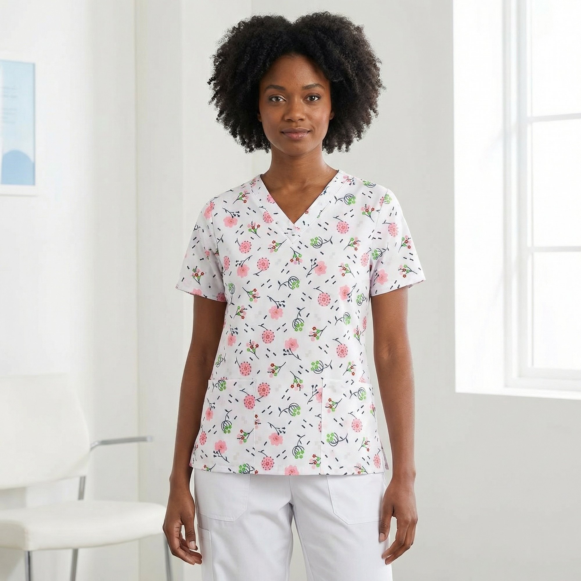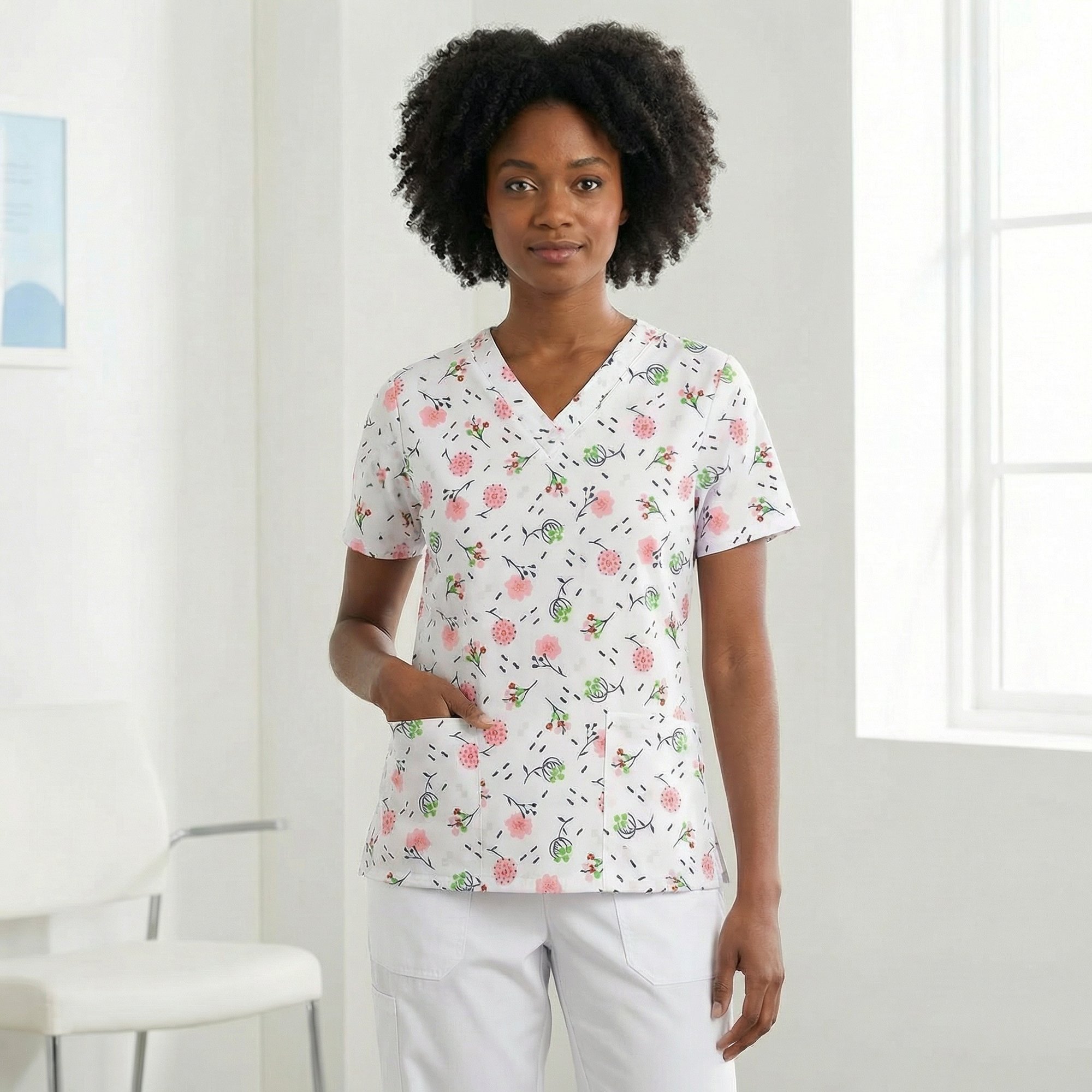 Classic V-neck scrub top with comfortable set-in sleeves for a clean, professional fit. Designed with two roomy lower patch pockets for convenient storage and side seam vents for added comfort and mobility. The soft floral and botanical print adds a light, cheerful touch to your workday.