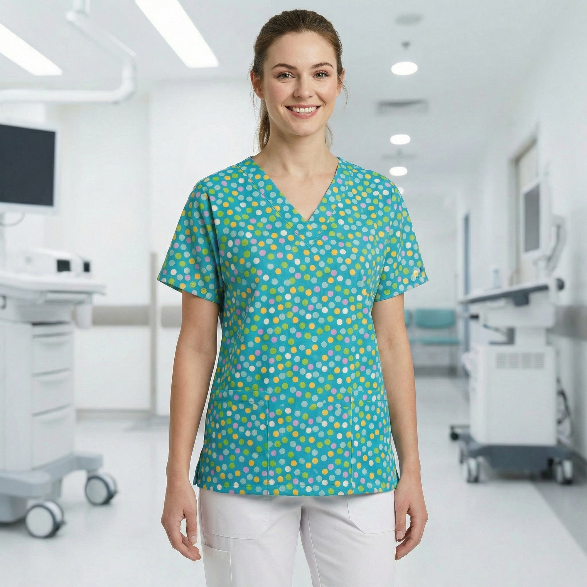 Classic V-neck scrub top with relaxed drop-shoulder sleeves for all-day comfort and easy movement. Designed with two convenient lower patch pockets for essentials and side seam vents for a flexible fit. The playful multicolor dot print adds a bright, cheerful touch to your workday.