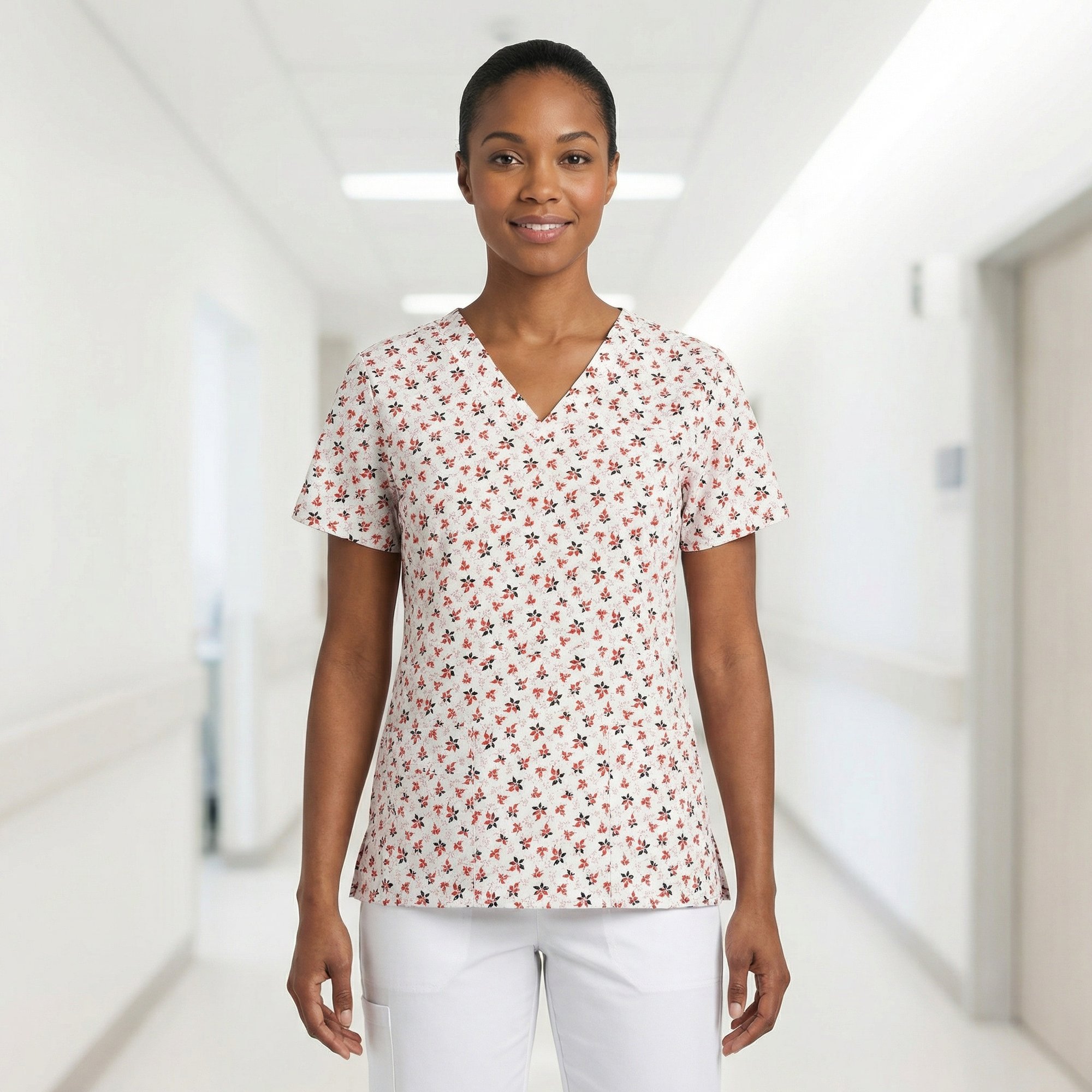 Classic V-neck scrub top with comfortable set-in sleeves for a clean, professional fit. Designed with two practical lower patch pockets for everyday essentials and side seam vents for added comfort and ease of movement. The delicate floral print adds a soft, cheerful touch to your workday.